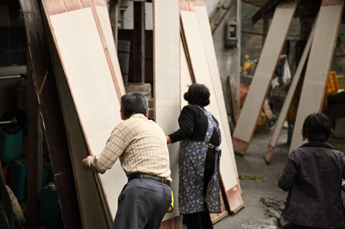 写真は、漉いたばかりの濡れた和紙を“天日干し”中に